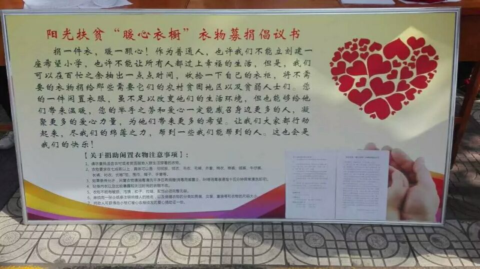 捐一件衣,暖一颗心!作为普通人,也许我们不能立刻建一座希望小学,也许不能让所有人都过上幸福的生活,但是,我们可以在百忙之中抽出一点点时间,收拾一下自己的衣柜,将不需要的衣物捐给那些需要它们的农村贫困地区以及贫弱人士们。社会需要温暖,时代也需要大家伸出双手去温暖这个社会,一份爱心就像一滴水,不能滋润一片土地,但是无数爱心可以汇聚成汪洋大海,可以让沙漠变成绿洲。