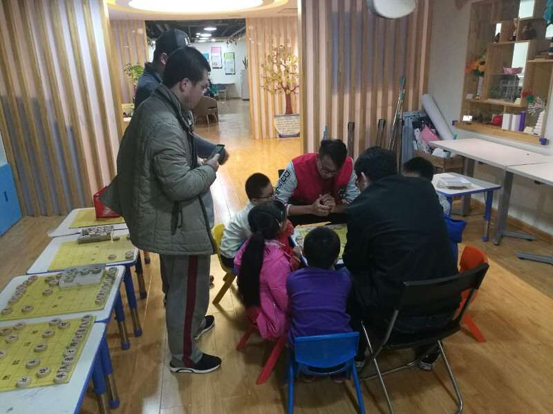 首先,我们教导小朋友们认识每一个棋子的摆放位置和名字。然后,我们教导小朋友们了解每一个棋子在棋盘中的走法及其作用。在小朋友们的大体认识后,我们展开了下一步的教导,也就是我们此次活动的最后一个计划。我们七名志愿者和八位小朋友分为四组,小朋友们两两对决,我们志愿者则负责指导他们如何在比赛中熟练的掌握每一个棋子的走法及作用,与一些下象棋的棋路技巧,并且不断地纠正他们在比赛时出现的错误。